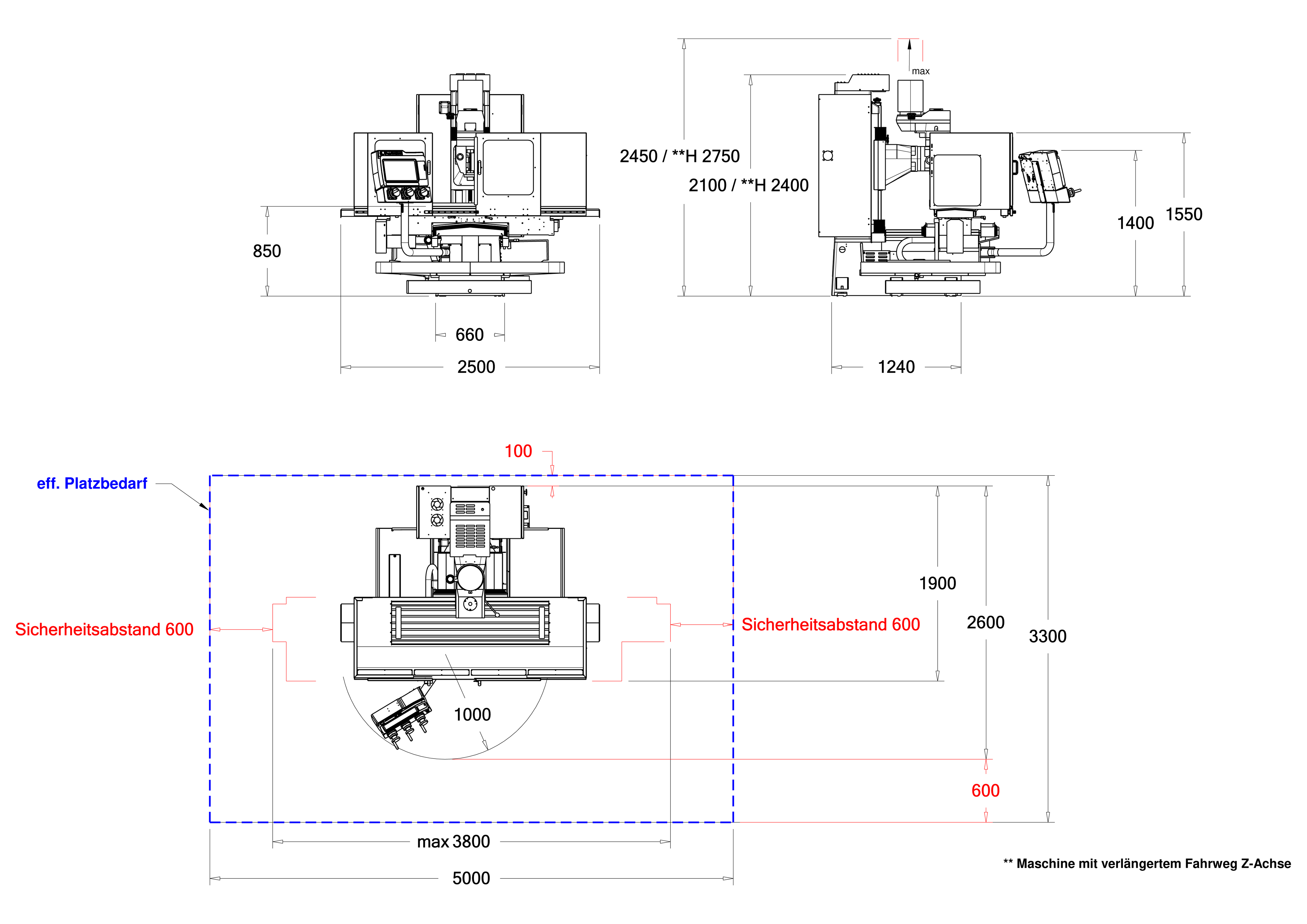 Platzbedarf mit Fahrweg L×T×H 2500 x 2300 x 2580 mm 3250 x 2600 x 2450 mm 3250 x 2600 x 2750 mm 3800 x 2600 x 2450 mm 3800 x 2600 x 2750 mm 4000 x 2600 x 2750 mm